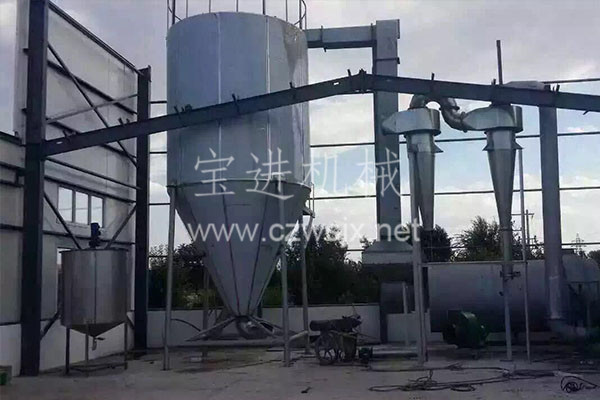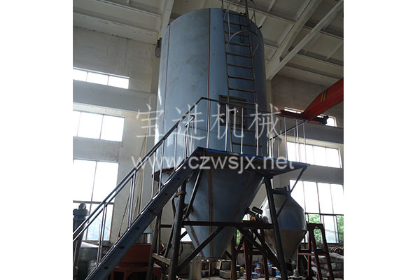 空氣經(jīng)過過濾和加熱,進(jìn)入干燥器頂部空氣分配器,熱空氣呈螺旋狀均勻地進(jìn)入干燥室。料液經(jīng)塔體頂部的高速離心霧化器,(旋轉(zhuǎn))噴霧成極細(xì)微的霧狀液珠,與熱空氣并流接觸,在極短的時間內(nèi)可干燥為成品。成品連續(xù)地由干燥塔底部和旋風(fēng)分離器中輸出,廢氣由風(fēng)機(jī)排空。